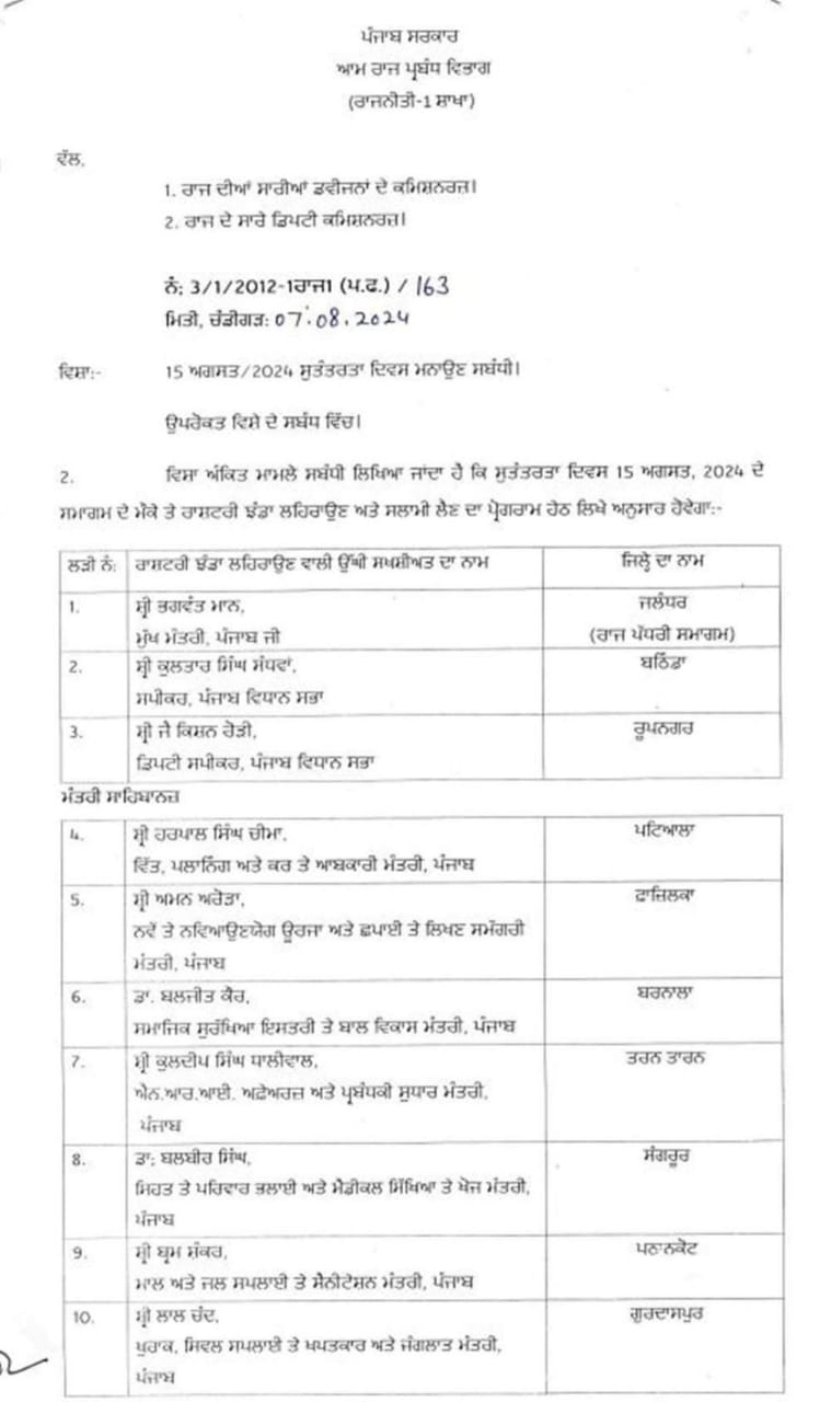 ਪੰਜਾਬ ਦੇ ਕੈਬਨਿਟ ਮੰਤਰੀ ਡਾਕਟਰ ਬਲਜੀਤ ਕੌਰ ਬਰਨਾਲਾ ਵਿੱਚ 15 ਅਗਸਤ ਮੌਕੇ ਰਾਸ਼ਟਰੀ ਝੰਡਾ ਲਹਿਰਾਉਣਗੇ। ਜਦ ਕਿ ਪੰਜਾਬ ਦੇ ਮੁੱਖ ਮੰਤਰੀ ਭਗਵੰਤ ਮਾਨ ਰਾਜ ਪੱਧਰੀ ਸਮਾਗਮ ਵਿੱਚ ਜਲੰਧਰ ਵਿੱਚ ਝੰਡਾ ਲਹਿਰਾਉਣਗੇ। ਪੰਜਾਬ ਸਰਕਾਰ ਵੱਲੋਂ ਜਾਰੀ ਕੀਤੀ ਗਈ ਸੂਚੀ ਵਿੱਚ ਇਸ ਦੀ ਜਾਣਕਾਰੀ ਦਿੱਤੀ ਗਈ।