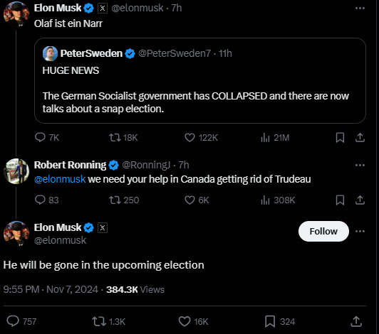 - ਐਲੋਨ ਮਸਕ ਨੇ ਕੈਨੇਡੀਅਨ ਪ੍ਰਧਾਨ ਮੰਤਰੀ ਜਸਟਿਨ ਟਰੂਡੋ ਨੂੰ ਟੱਕਰ ਦਿੱਤੀ। ਐਲੋਨ ਮਸਕ ਨੇ ਭਵਿੱਖਬਾਣੀ ਕੀਤੀ ਹੈ ਕਿ ਟਰੂਡੋ ਆਉਣ ਵਾਲੀਆਂ ਚੋਣਾਂ ਹਾਰ ਜਾਣਗੇ। ਉਸਦੀ ਸਰਕਾਰ ਜਾਣ ਵਾਲੀ ਹੈ। ਮਸਕ ਨੇ ਕਿਹਾ ਕਿ ਟਰੂਡੋ 20 ਅਕਤੂਬਰ, 2025 ਨੂੰ ਜਾਂ ਇਸ ਤੋਂ ਪਹਿਲਾਂ ਹੋਣ ਵਾਲੀਆਂ ਕੈਨੇਡੀਅਨ ਫੈਡਰਲ ਚੋਣਾਂ ਵਿੱਚ ਚੋਣ ਲੜਨਗੇ। ਉਨ੍ਹਾਂ ਇਹ ਪ੍ਰਤੀਕਿਰਿਆ ਜਰਮਨੀ ਦੀ ਸਮਾਜਵਾਦੀ ਸਰਕਾਰ ਦੇ ਪਤਨ ਬਾਰੇ ਗੱਲ ਕਰਨ ਵਾਲੀ ਇੱਕ ਪੋਸਟ 'ਤੇ ਦਿੱਤੀ। "ਟਰੂਡੋ ਆਉਣ ਵਾਲੀਆਂ ਚੋਣਾਂ ਵਿੱਚ ਚਲੇ ਜਾਣਗੇ"।