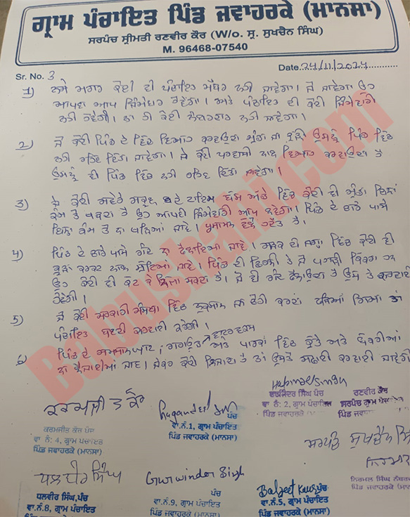 - ਪ੍ਰਸਿੱਧ ਗਾਇਕ ਸਿੱਧੂ ਮੂਸੇਵਾਲਾ ਦੇ ਕਤਲ ਨਾਲ ਜੁੜੇ ਪਿੰਡ ਜਵਾਹਰਕੇ (ਮਾਨਸਾ) ਦੀ ਪੰਚਾਇਤ ਨੇ ਸਖਤ ਫੈਸਲੇ ਲਏ ਹਨ। ਪਿੰਡ ਦੀ ਪੰਚਾਇਤ ਵੱਲੋਂ ਨਸ਼ਿਆਂ, ਮੁੰਡੇ ਕੁੜੀ ਦੇ ਵਿਆਹ ਕਰਾਉਣ, ਸਕੂਲ ਟਾਈਮ ਬੱਸਾਂ ਮਗਰ ਮੁੰਡਿਆਂ ਵੱਲੋਂ ਗੇੜੀਆਂ ਮਾਰਨਾ, ਪਿੰਡ ਵਿੱਚ ਗੰਦ ਨਾ ਪਾਉਣ, ਸਰਕਾਰੀ ਸੰਸਥਾ ਨੂੰ ਨੁਕਸਾਨ ਨਾ ਪਹੁੰਚਾਉਣ ਸਮੇਤ ਕਈ ਅਹਿਮ ਫੈਸਲੇ ਲਏ ਗਏ ਹਨ।