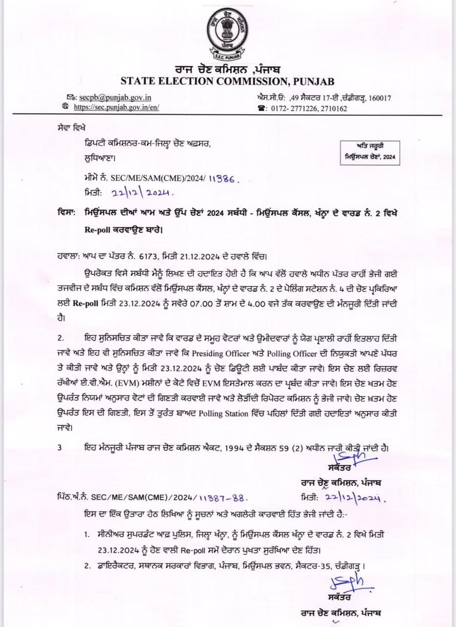 ਖੰਨਾ ਮਿਉਂਸਪਲ ਕੌਂਸਲ ਦੇ ਵਾਰਡ ਨੰਬਰ 2 ਦੇ ਪੋਲਿੰਗ ਸਟੇਸ਼ਨ ਨੰਬਰ 4 'ਤੇ ਦੁਬਾਰਾ ਪੋਲਿੰਗ ਦਾ ਫੈਸਲਾ। ਡਿਪਟੀ ਕਮਿਸ਼ਨਰ ਅਤੇ ਜਿਲ੍ਹਾ ਚੋਣ ਅਧਿਕਾਰੀ ਨੇ ਇਸ ਸਬੰਧੀ ਪੱਤਰ ਜਾਰੀ ਕੀਤਾ ਹੈ।। ਦੁਬਾਰਾ ਪੋਲਿੰਗ 23 ਦਸੰਬਰ 2024 ਨੂੰ ਸਵੇਰੇ 7:00 ਵਜੇ ਤੋਂ ਸ਼ਾਮ 4:00 ਵਜੇ ਤੱਕ ਹੋਵੇਗੀ।