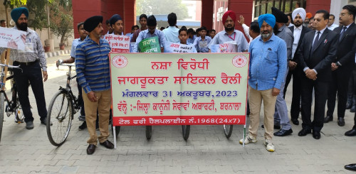 ਮਾਨਯੋਗ ਮੈਂਬਰ ਸਕੱਤਰ, ਪੰਜਾਬ ਰਾਜ ਕਾਨੂੰਨੀ ਸੇਵਾਵਾਂ ਅਥਾਰਟੀ, ਐੱਸ.ਏ.ਐੱਸ. ਨਗਰ ਜੀ ਦੀਆਂ ਹਦਾਇਤਾਂ ਅਤੇ ਮਾਨਯੋਗ ਜ਼ਿਲ੍ਹਾ ਅਤੇ ਸੈਸ਼ਨਜ਼ ਜੱਜ—ਸਹਿਤ—ਚੇਅਰਮੈਨ, ਜ਼ਿਲ੍ਹਾ ਕਾਨੂੰਨੀ ਸੇਵਾਵਾਂ ਅਥਾਰਟੀ, ਬਰਨਾਲਾ ਜੀ ਦੀ ਅਗਵਾਈ ਹੇਠ ਜ਼ਿਲ੍ਹਾ ਕਾਨੂੰਨੀ ਸੇਵਾਵਾਂ ਅਥਾਰਟੀ, ਬਰਨਾਲਾ ਵੱਲੋਂ ਮਿਤੀ 01.10.2023 ਤੋਂ ਮਿਤੀ 31.10.2023 ਤੱਕ ਜਿਲ੍ਹਾ ਬਰਨਾਲਾ ਵਿਖੇ “ਪੰਜਾਬ ਅਗੇਂਸਟ ਡਰੱਗਅਡਿਕਸ਼ਨ” ਮੁਹਿੰਮ ਚਲਾਈ ਗਈ, ਜਿਸ ਦੌਰਾਨ ਨਸ਼ਿਆ ਦਾ ਮਾੜੇ ਪ੍ਰਭਾਵਾਂ ਸਬੰਧੀ ਲੋਕਾਂ ਨੂੰ ਜਾਗਰੂਕ ਕਰਨ ਲਈ ਸੈਮੀਨਾਰਾਂ/ਵੈਬੀਨਾਰ, ਨੁੱਕੜਨਾਟਕੁ, ਡੀਬੇਟ ਪ੍ਰਤੀਯੋਗਤਾਵਾਂ,ਪੋਸਟਰ ਮੇਕਿੰਗ ਮੁਕਾਬਲਿਆਂ ਦਾ ਆਯੋਜਨ ਕੀਤਾ ਗਿਆ।ਇਸੇ ਮੁਹਿੰਮ ਅਧੀਨ ਅੱਜ ਮਿਤੀ 31.10.2023 ਨੂੰ ਜਿਲ੍ਹਾ ਕੋਰਟ ਕੰਪਲੈਕਸ ਬਰਨਾਲਾ ਤੋਂ ਇੱਕ ਸਾਈਕਲ ਰੈਲੀ ਦਾ ਆਯੋਜ਼ਨ ਕੀਤਾ ਗਿਆ ਜਿਸ ਵਿੱਚ ਸਰਕਾਰੀ ਸੀਨੀਅਰ ਸੈਕੰਡਰੀ ਸਕੂਲ ਜੁਮਲਾ ਮਲਕਣ ਅਤੇ ਸਰਕਾਰੀ ਸੀਨੀਅਰ ਸੈਕੰਡਰੀ ਸਕੂਲ ਬਰਨਾਲਾ ਦੇ ਵਿਦਿਆਰਥੀਆਂ ਨੇ ਹਿੱਸਾ ਲਿਆ।ਸ਼੍ਰੀ ਬੀ.ਬੀ.ਐੱਸ. ਤੇਜ਼ੀ, ਮਾਨਯੋਗ ਜਿਲ੍ਹਾ ਅਤੇ ਸੈਸ਼ਨਜ਼ ਜੱਜ ਬਰਨਾਲਾ ਵੱਲੋ੍ਹਂ ਹਰੀ ਝੰਡੀ ਦੇ ਕੇ ਇਸ ਰੈਲੀ ਨੂੰ ਰਵਾਨਾ ਕੀਤਾ ਗਿਆ। ਇਸ ਮੌਕੇ ਸਮੂਹ ਜੁਡੀਸ਼ੀਅਲ ਅਫ਼ਸਰ ਸਾਹਿਬਾਨ, ਵਕੀਲ ਸਾਹਿਬਾਨ, ਡੀ.ਈ.ਓ.ਦਫ਼ਤਰ ਬਰਨਾਲਾ ਵੱਲੋ੍ਹਂ ਲਾਅ ਅਫ਼ਸਰ, ਸਕੂਲ ਅਧਿਆਪਕ,ਪੈਰਾ ਲੀਗਲ ਵਲੰਟੀਅਰ, ਸਟਾਫ਼ ਮੈਂਬਰ ਆਦਿ ਮੌਜੂਦ ਸਨ।
