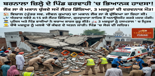 बरनाला के फरवाही गांव में जैक से मकान उठाते समय लेंटर गिरने से तीन मजदूरों की दर्दनाक मौत हो गई। मलबे में दबे एक अन्य मजदूर को निकालने के लिए बचाव अभियान जारी है।