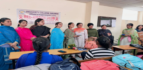 ਰੈੱਡ ਰਿਬਨ ਕਲੱਬ ਵੱਲੋਂ ਯੂਨੀਵਰਸਿਟੀ ਕਾਲਜ ਢਿਲਵਾਂ ਵਿਖੇ ਪ੍ਰਿੰਸੀਪਲ ਡਾ. ਲਖਵਿੰਦਰ ਸਿੰਘ ਰੱਖੜਾ ਦੀ ਅਗਵਾਈ ਹੇਠ ਔਰਤ ਦਿਵਸ ਮਨਾਇਆ ਗਿਆ।ਰੈੱਡ ਰਿਬਨ ਕਲੱਬ ਦੇ ਨੋਡਲ ਅਫ਼ਸਰ ਪ੍ਰੋਫੈਸਰ ਕਰਮਜੀਤ ਕੌਰ ਅਤੇ ਪ੍ਰੋਫੈਸਰ ਜਗਦੀਪ ਕੌਰ ਅਤੇ ਸਮੂਹ ਸਟਾਫ ਵੱਲੋਂ ਔਰਤ ਦਿਵਸ ਦੇ ਸਬੰਧ ਵਿੱਚ ਡਾ. ਹਰਪ੍ਰੀਤ ਕੌਰ ਰੂਬੀ ਦਾ ਲੈਕਚਰ ਕਰਵਾਇਆ ਗਿਆ। ਜਿਸ ਵਿਚ ਉਹਨਾਂ ਨੇ ਔਰਤ ਦੀ ਸਮਾਜ ਵਿੱਚ ਸਥਿਤੀ ਅਤੇ ਉਸਦੇ ਮਾਣ ਸਨਮਾਨ ਸਬੰਧੀ ਆਪਣੇ ਵਡਮੁੱਲੇ ਵਿਚਾਰ ਵਿਦਿਆਰਥੀਆਂ ਨਾਲ ਸਾਂਝੇ ਕੀਤੇ।ਇਸ ਮੌਕੇ ਵਿਦਿਆਰਥੀਆਂ ਦੇ ਪੋਸਟਰ ਮੇਕਿੰਗ, ਲੇਖ ਮੁਕਾਬਲੇ ਅਤੇ ਮਹਿੰਦੀ ਦੇ ਮੁਕਾਬਲੇ ਕਰਵਾਏ ਗਏ। ਜਿਸ ਵਿੱਚ ਪਹਿਲਾ, ਦੂਜਾ ਅਤੇ ਤੀਜਾ ਸਥਾਨ ਪ੍ਰਾਪਤ ਕਰਨ ਵਾਲੇ ਵਿਦਿਆਰਥੀਆਂ ਨੂੰ ਸਨਮਾਨਿਤ ਕੀਤਾ ਗਿਆ।ਇਸ ਮੌਕੇ ਹਾਜਰ ਵਿਦਿਆਰਥੀਆਂ ਨੂੰ ਰਿਫਰੈਸ਼ਮੈਂਟ ਵੀ ਦਿੱਤੀ ਗਈ। ਇਸ ਮੌਕੇ ਸਮੂਹ ਸਟਾਫ਼ ਅਤੇ ਵਿਦਿਆਰਥੀ ਹਾਜਰ ਸਨ।