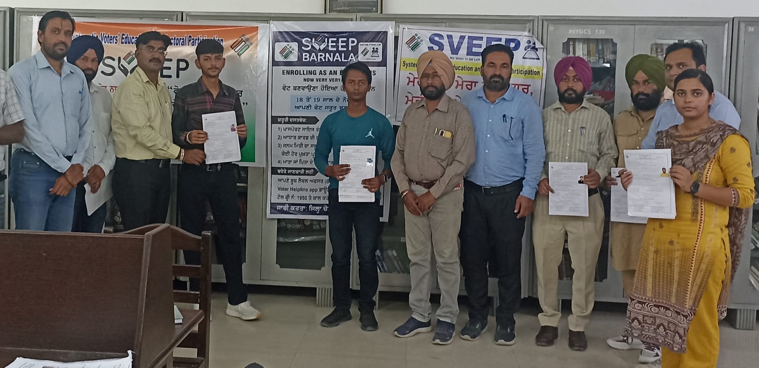 ਜ਼ਿਲ੍ਹਾ ਚੋਣ ਅਫ਼ਸਰ ਬਰਨਾਲਾ ਸਹਿਤ ਡਿਪਟੀ ਕਮਿਸ਼ਨਰ ਬਰਨਾਲਾ ਸ੍ਰੀਮਤੀ ਪੂਨਮਦੀਪ ਕੌਰ ਅਤੇ ਚੋਣਕਾਰ ਰਜਿਸਟ੍ਰੇਸ਼ਨ ਅਫ਼ਸਰ ਵਿ.ਸ.103 ਕਮ ਉਪ ਮੰਡਲ ਮੈਜਿਟਰੇਟ ਬਰਨਾਲਾ ਸ. ਗੋਪਾਲ ਸਿੰਘ ਦੇ ਦਿਸ਼ਾ ਨਿਰਦੇਸ਼ਾਂ ਅਨੁਸਾਰ ਸਵੀਪ ਨੋਡਲ ਅਫ਼ਸਰ ਬਰਨਾਲਾ 103 ਦੀ ਅਗਵਾਈ ਹੇਠ 18-19 ਸਾਲ ਦੇ ਨੌਜਵਾਨ ਨੂੰ ਆਪਣੀ ਵੋਟ ਬਣਾਉਣ ਅਤੇ ਲੋਕਤੰਤਰ ਦੀ ਸਫਲਤਾ ਨੂੰ ਯਕੀਨੀ ਬਣਾਉਣ ਵਿੱਚ ਆਪਣਾ ਬਣਦਾ ਸਹਿਯੋਗ ਪਾਉਣ ਲਈ ਵੋਟ ਦੀ ਸਹੀ ਵਰਤੋਂ ਕਰਨ ਲਈ ਪ੍ਰੇਰਿਤ ਕਰਨ ਲਈ ਸ਼ਹੀਦ- ਏ - ਆਜ਼ਮ ਸਰਦਾਰ ਭਗਤ ਸਿੰਘ ਦੇ ਜਨਮ ਦਿਹਾੜੇ 'ਤੇ ਵੋਟਰ ਰਜਿਸਟ੍ਰੇਸ਼ਨ ਕੈਂਪ ਲਗਾਇਆ ਗਿਆ।