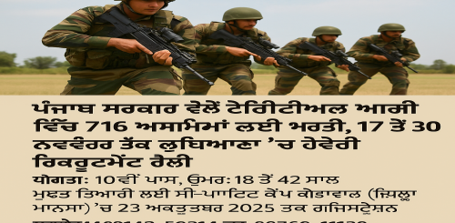 पंजाब सरकार ने टेरिटोरियल आर्मी में 716 पदों पर भर्ती निकाली है। भर्ती रैली 17 से 30 नवंबर 2025 तक लुधियाना में आयोजित होगी। योग्य उम्मीदवार बोडावाल कैम्प, जिला मानसा में निशुल्क प्रशिक्षण प्राप्त कर सकते हैं।